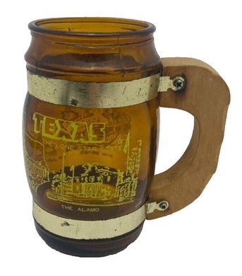 Amber Brown Texas Souvenir Barrel Mug Glass Cup Wood Handle Alamo Cotton Bowl