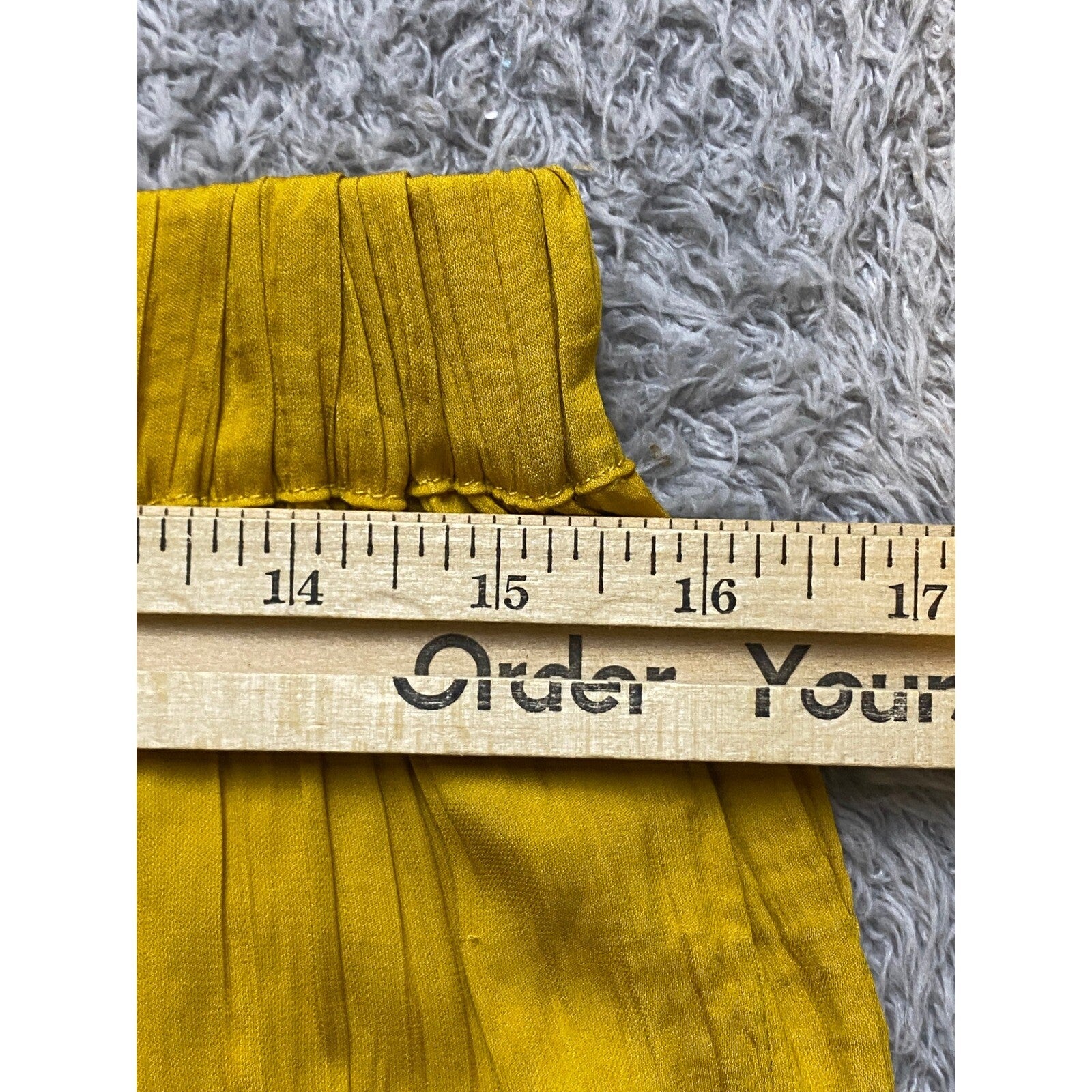 Golden sunshine captured in fabric, these wide-leg palazzo pants offer a breezy, effortless style. The high waist creates a flattering silhouette, while the flowy design ensures comfort and freedom of movement. The textured fabric adds a touch of sophistication, and the convenient side pockets blend practicality with chic design. Imagine yourself strolling through a farmer's market on a sunny Saturday morning, or enjoying a relaxed evening at an outdoor concert, or even adding a pop of color to your office wardrobe.