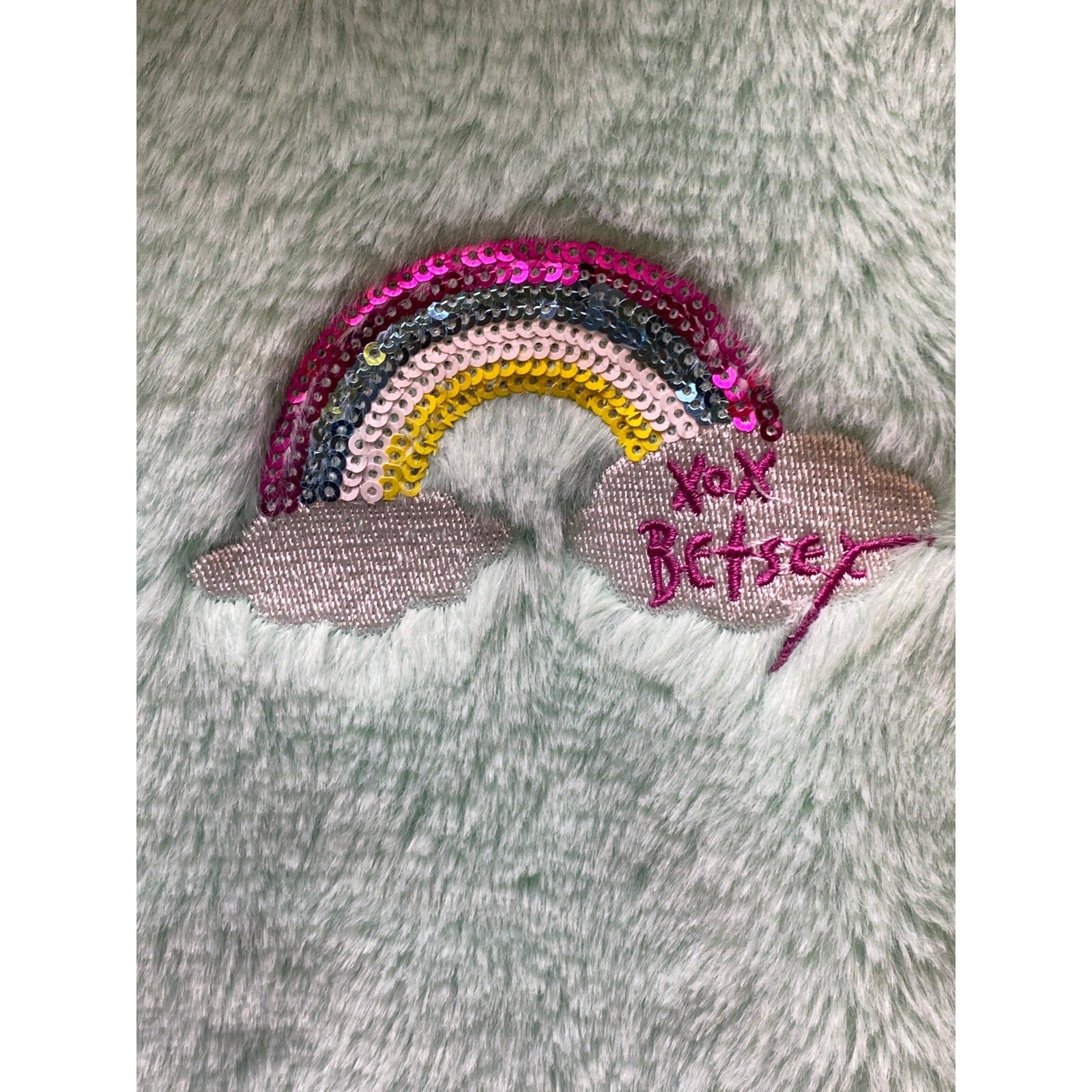 Snuggle up in style with this adorable Betsey Johnson hoodie! A plush, fuzzy texture invites warmth and comfort, making it a go-to piece for cooler days. The dreamy mint green color is perfectly complemented by the sequined "DREAM" lettering on the hood and a charming rainbow and cloud design on the front.
