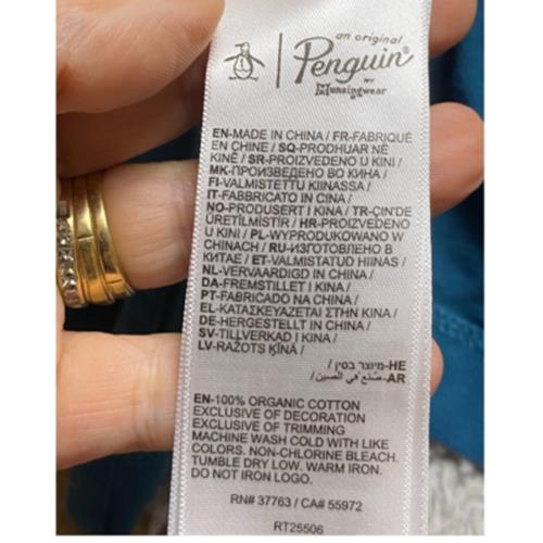 Keywords: Original Penguin, polo shirt, men's polo, short sleeve polo, casual shirt, organic cotton, teal polo, white trim, embroidered logo, men's fashion, size XL, classic polo, golf shirt, preppy style