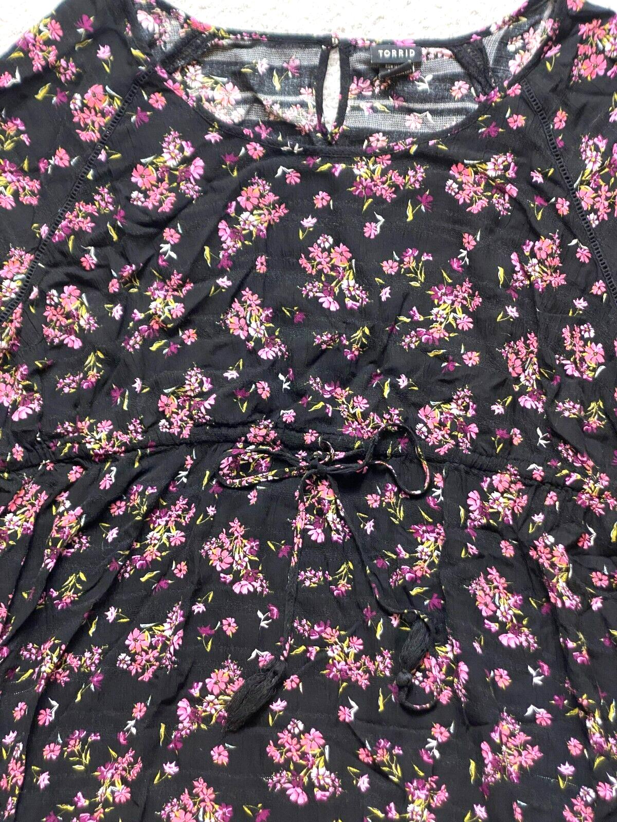 Torrid Shirt Womens 3 3X Black AOP Flower Tunic Gauze Tasseled Boho Hippie Plus