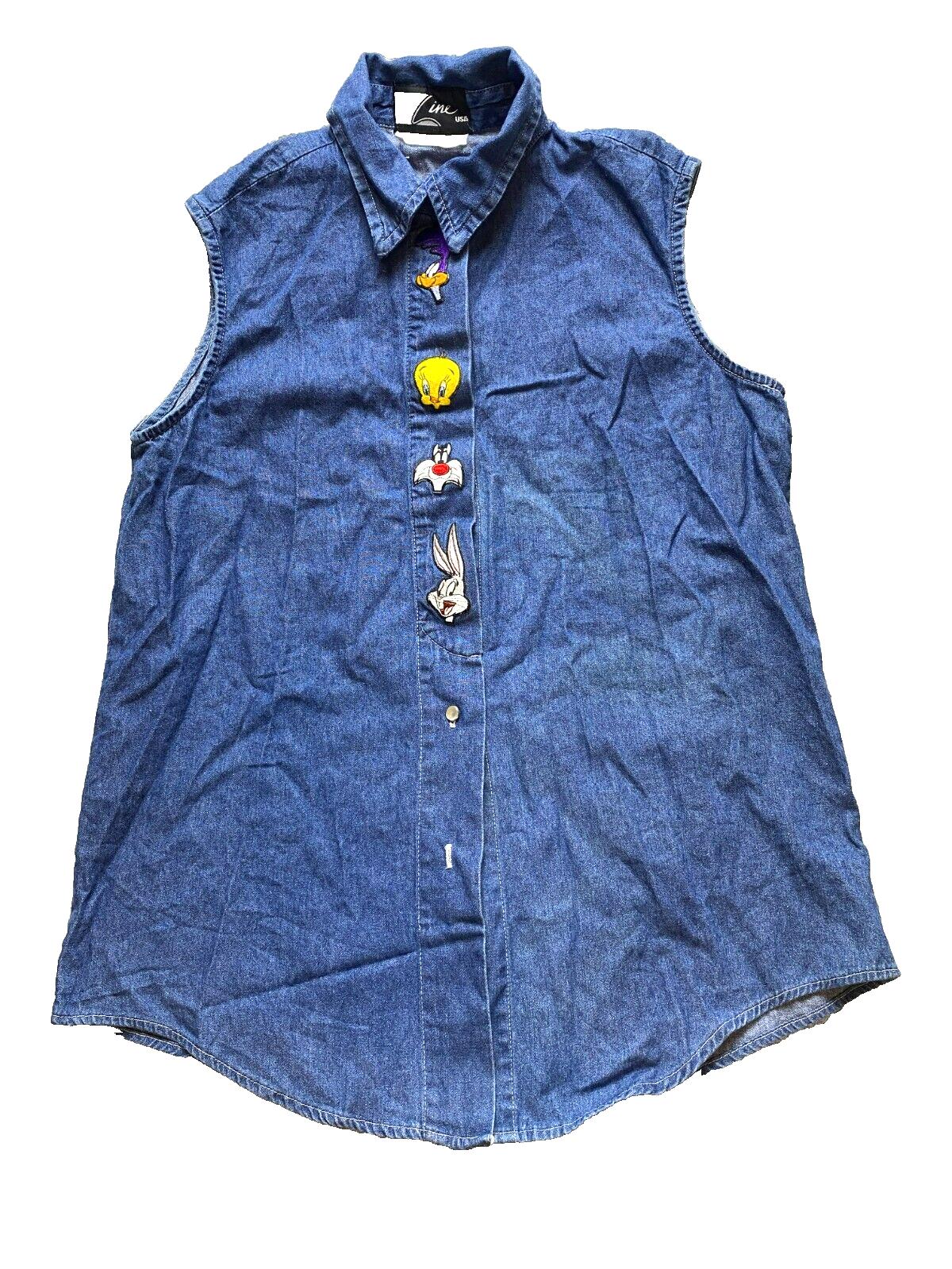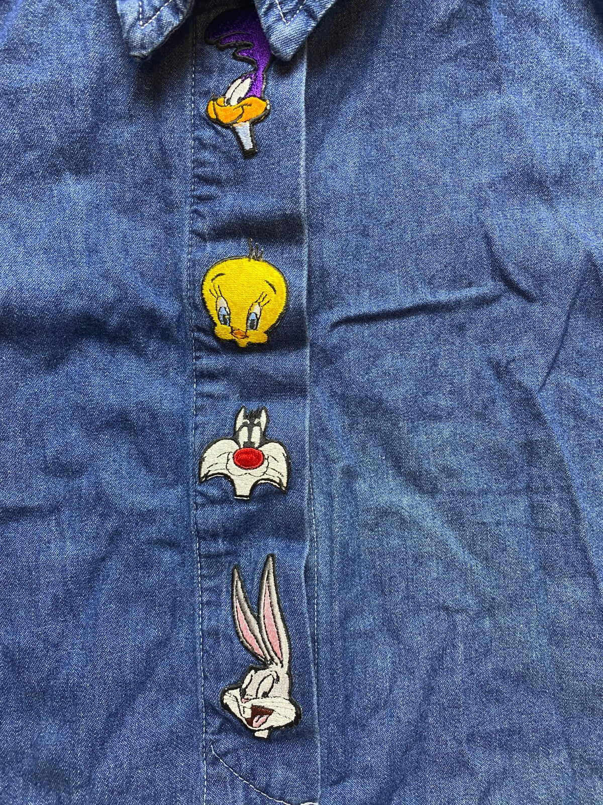 VTG Looney Tunes Shirt Womens Extra Large Button Up Denim Tweety Bunny Tunic USA